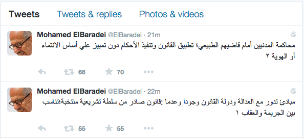 وحدد البرادعي خلال تدوينة له على موقع التدوينات القصيرة “تويتر” هذه المبادئ في أمرين أولهما “أن قانون صادر من سلطة تشريعية منتخبة تناسب بين الجريمة والعقاب”.