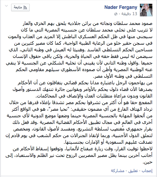 وشدد فرجاني خلال منشور له على صفحته الشخصية على موقع التواصل الاجتماعي “فيس بوك” أنه لا تثريب على تخلي محمد سلطان عن جنسيته المصرية مضيفًا أنه ما كان سيجني منها في ظل الحكم العسكري الباطش إلا المزيد من العذاب والموت في سجن حقير خلو من الرعاية الطبية الواجبة كما كان مصير كثير من مساجين الحكم التسلطي الفاسد”.