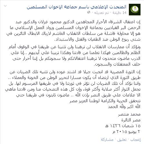 وشدد- عبر منشور له على موقع التواصل الاجتماعي “فيس بوك”- أن “تلك الضربات لن تؤثر في ثورتنا ولا في طريقها المرسوم لها. بل تجعل الثوار أكثر صلابة وأكثر قوة، وإن كل هذه التضحيات منا ومن قادتنا ماهي الا علامات علي طريق النصر بإذن الله .. ماضون ثابتون في طريقنا حتي تتحقق الحرية والكرامة لوطننا العزيز مصر