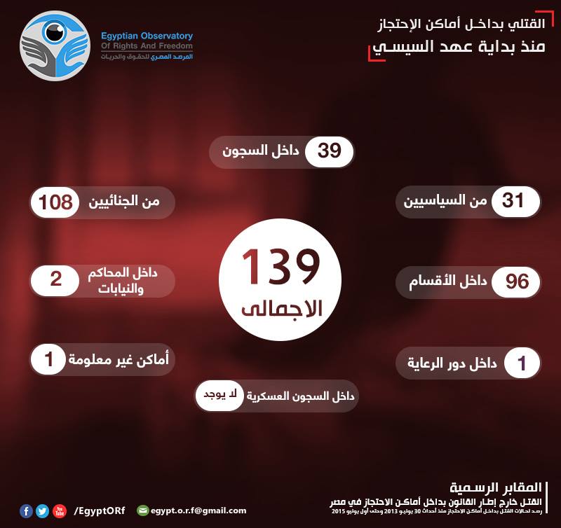 - القتلى بداخل أماكن الاحتجاز منذ بداية عهد السيسي وحتي الآن 139حالة.