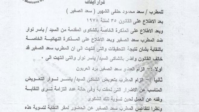 ونظرا لتقاعس سعد الصغير عن الحضور لمقر النقابة لتسوية هذه المشكلة رغم إخطاره أكثر من مرة، قررت نقابة الموسيقيين وقف العضو سعد محمود حنفي، الشهير بـ”سعد الصغير”، عن العمل، وإخطار جميع الفنادق وإدارة الشؤون المعنوية بهذا القرار لتنفيذه، لحين تسوية تلك المشكلة.