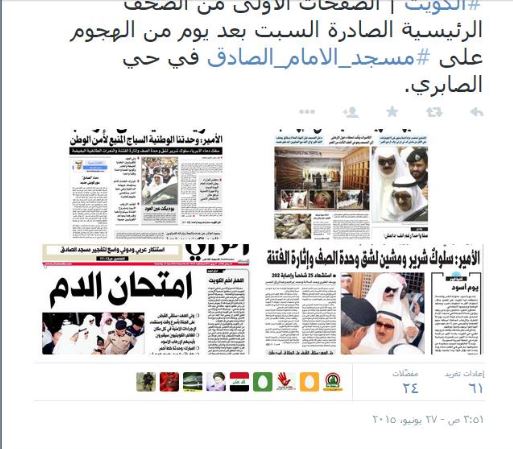اهتمت الصحف العربية وخصوصًا الخليجية، بالحادث الإرهابي الذي وقع، أمس الجمعة، حين قام عنصر بتفجير نفسه بمسجد الإمام الصادق الشيعي بالكويت، مما أسفر عن وقوع العديد من القتلى والجرحى، وكذلك الحادث الذي وقع بمنتجع مدينة سوسة التونسية وأدى لمقتل 39 شخصًا وإصابة آخرين.