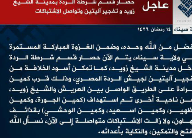 وقال البيان: “بفضل الله وحده، وضمن العزوة المباركة والمستمرة في ولاية سيناء، يتم الآن حصار قسم شرطة الردة داخل مدينة الشيخ زويد”.