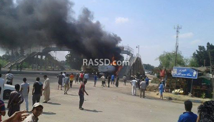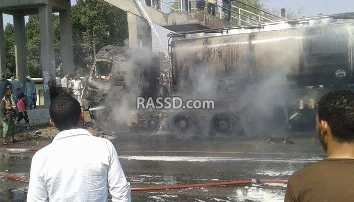 ويحاول فريق الحماية المدنية، بمديرية أمن الإسماعيلية، انتشال الجثث المتفحمة، واستخراج سيارة أجرة ملاكي أسفل سيارة المواد البترولية المشتعلة.