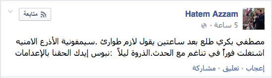 وقال عزام -خلال منشور له على موقع التواصل الاجتماعي “فيس بوك”-: مصطفي بكري طلع بعد ساعتين يقول لازم طوارئ.. سيمفونية الأذرع الأمنية اشتغلت فورًا في تناغم مع الحدث.. الذروة ليلًا: نبوس إيدك الحقنا بالإعدامات”.