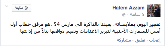 قال حاتم عزام، نائب رئيس حزب الوسط وعضو مجلس الشعب السابق، إن “تفجير اليوم، بملابساته، يعيدنا بالذاكرة إلى مارس 54، هو مرفق خطاب أول أمس للسفارات الأجنبية لتبرير الاعدامات وتفهم دوافعها بدلًا من إدانتها”.