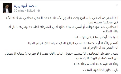 من جانبه، علق المحامي والناشط الحقوقي محمد أبو هريرة قائلا: “إيه الفجر ده.. اصحي يا سامح يا عاشور الأستاذ محمد الجمل محامي تم قتله الآن في محكمة مدينة نصر، المحامي شد مع موظف أو أمين شرطة طلع أمين الشرطة الطبنجة وضربة بالنار أه والله العظيم.. أه يا بلد أرخص ما فيكي الإنسان”.