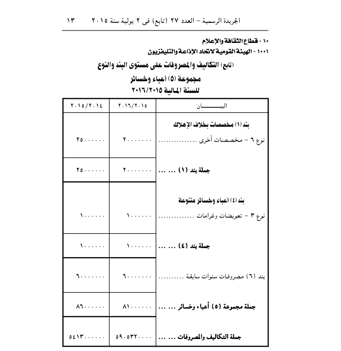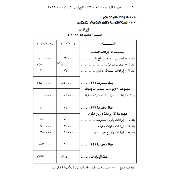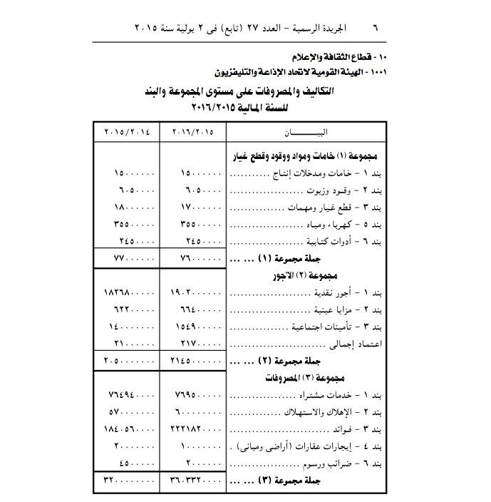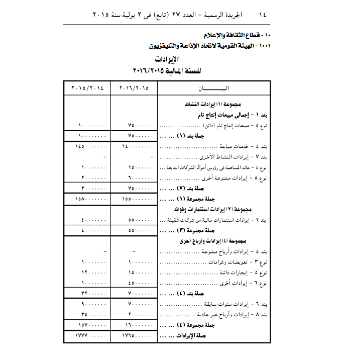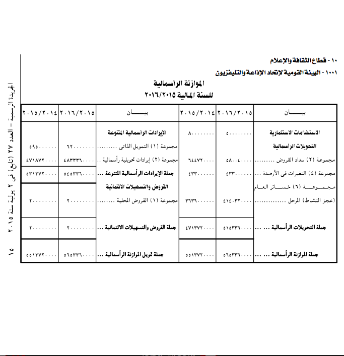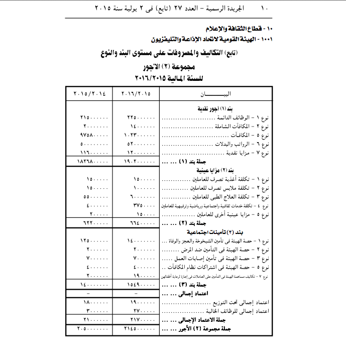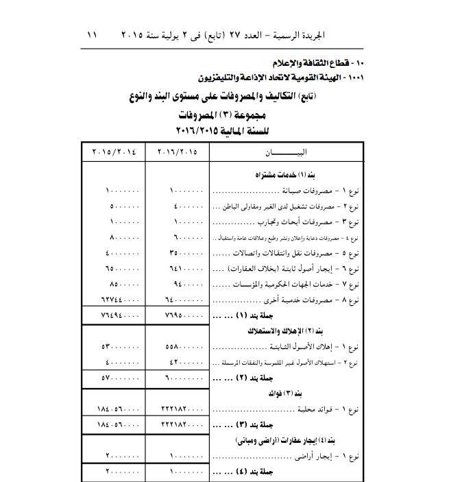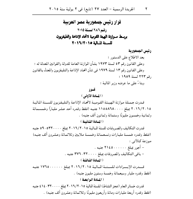 أصدر قائد الانقلاب عبدالفتاح السيسى، قرارًا بقانون بربط موازنة الهيئة القومية لاتحاد الإذاعة والتلفزيون، للسنة المالية الجارية 2015/ 2016، والتي قدرت بمبلغ 11 مليارًا و558 مليونًا و680 ألف جنيه.