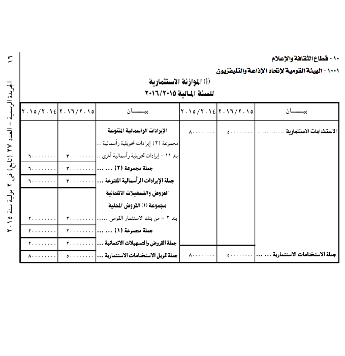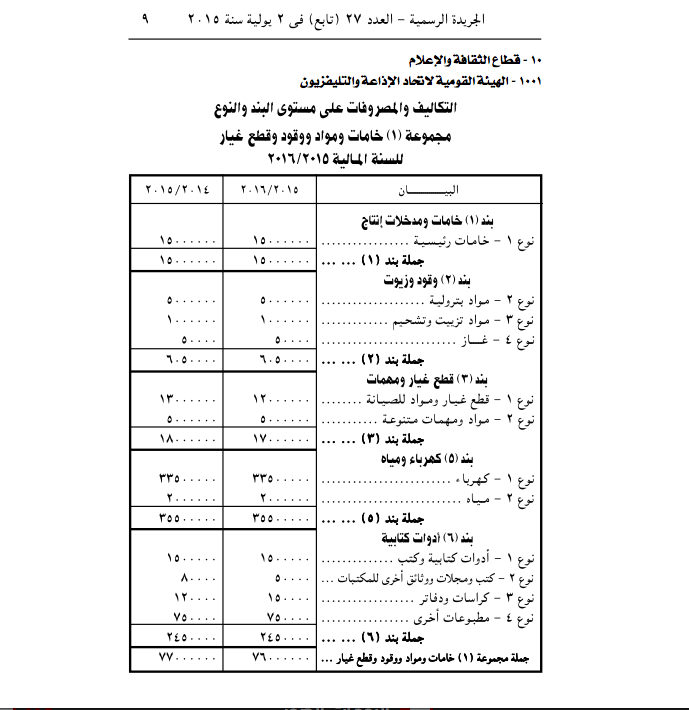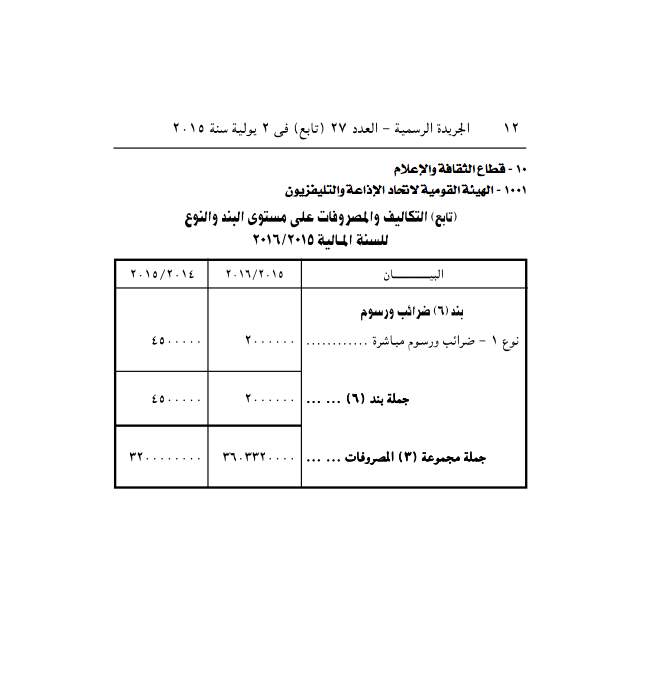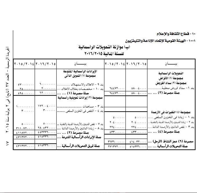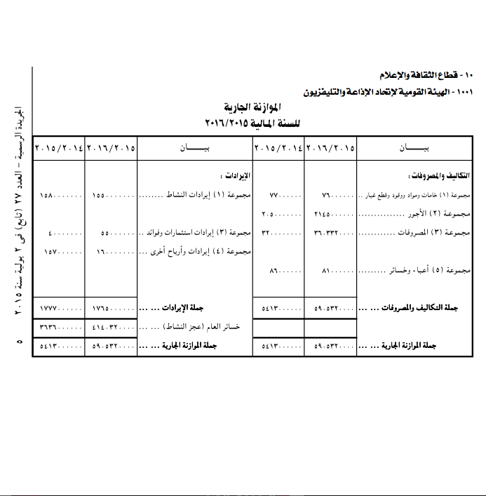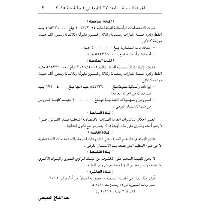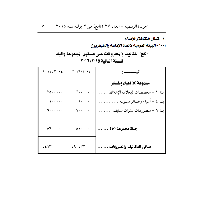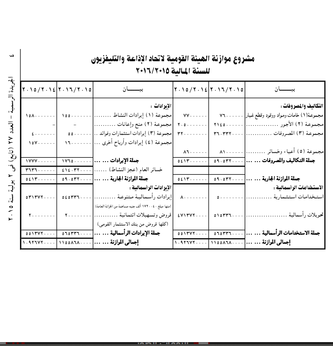 أصدر قائد الانقلاب عبدالفتاح السيسى، قرارًا بقانون بربط موازنة الهيئة القومية لاتحاد الإذاعة والتلفزيون، للسنة المالية الجارية 2015/ 2016، والتي قدرت بمبلغ 11 مليارًا و558 مليونًا و680 ألف جنيه.