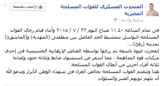 وقال المتحدث العسكري -في بيان له، اليوم الخميس-: إنه في تمام الساعة ١١.٤٠ صباح اليوم أثناء قيام جنود القوات المسلحة بتمشيط الحد الفاصل بين منطقتي المهدية والماسورة بمدينة رفح، انفجرت عبوة ناسفة تم زرعها بواسطة – من أسماهم – العناصر الإرهابية، في إحدى مركبات قوة المداهمة، مما أسفر عن استشهاد ضابط وثلاثة جنود وإصابة ثلاثة أفراد آخرين من القوات المسلحة.