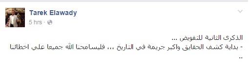 وقال “العوضي” في منشور له على حسابه الشخصي عبر موقع “فيس بوك”: “الذكرى الثانية للتفويض – بداية كشف الحقائق وأكبر جريمة في التاريخ .. فليسامحنا الله جميعا علي أخطائنا”.