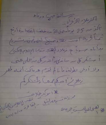 “الزملاء الأعزاء.. أكثر من 25 يومًا حتى الآن خلف القضبان، أدفع ثمنًا لحرية آمنت بها وتمنيتها لبني وطني ومشروع بدأناه معا مع زملاء المهنة، نقابة الإعلام الإلكتروني.