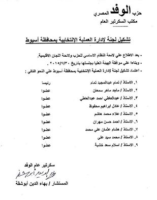 أجرى المستشار بهاء الدين أبو شقة، سكرتير عام حزب الوفد، تعديلات على لجنة إدارة العملية الانتخابية للحزب بمحافظة أسيوط، وذلك لاختيار مرشحي الحزب في جميع الدوائر الانتخابية والذين سيتم دعمهم من قِبَل الحزب.
