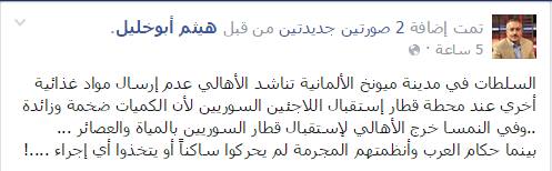 وقال -عبر منشور له على “فيس بوك”-: “السلطات في مدينة ميونخ الألمانية تناشد الأهالي عدم إرسال مواد غذائية أخرى عند محطة قطار استقبال اللاجئين السوريين؛ لأن الكميات ضخمة وزائدة، وفي النمسا خرج الأهالي لاستقبال قطار السوريين بالمياه والعصائر”.