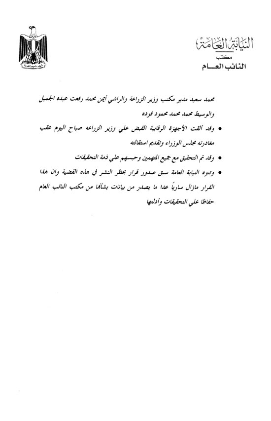 وكانت النيابة العامة قد قررت مساء اليوم، حبس كل من وزير الزراعة المستقيل، صلاح الدين هلال، ومدير مكتبه محيي الدين قدح، ورجل الأعمال أيمن الجميل، “الراشي”، ومدير مكتب وزير الثقافة الأسبق محمد فودة، “الوسيط”، المتهمين في قضية الرشوة والفساد بوزارة الزراعة.