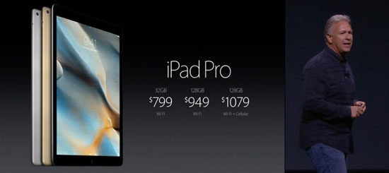 وقالت أبل ضمن فعاليات مؤتمرها الذى قام في بسان فرانسيكسو عن سعر iPad Pro، إنه يبدأ من 799 دولارًا للنسخة المزودة بمساحة تخزين 32 جيجابايت، و949 دولارًا للنسخة الواي فاي فقط 128 جيجابايت، و1079 دولارًا للنسخة 128 جيجابايت.