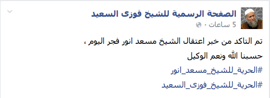 نشرت الصفحة الرسمية للشيخ فوزي السعيد، الداعية السلفي، خبرًا يؤكد اعتقال الشيخ مسعد أنور، مقدم البرامج على عدد من القنوات الإسلامية، أبرزها قناة “الرحمة”.