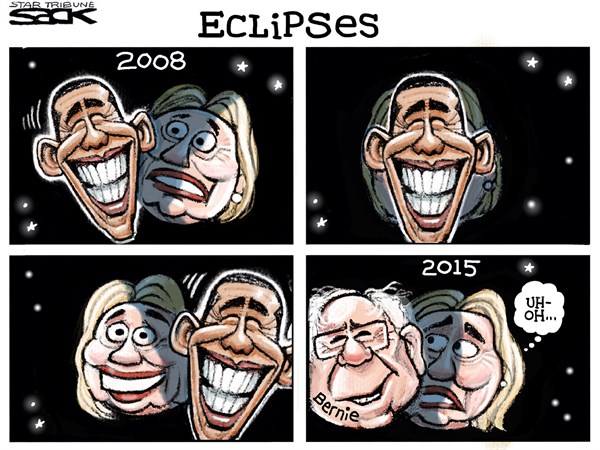 ونشرت الصحيفة الأميركية “كاجل كارتون” رسما تناولت فيه سباق الانتخابات الرئاسية المزمع في الولايات المتحدة، وجسد الرئيس الأمريكي، باراك أوباما، ووزيرة الخارجية الأمريكية السابقة، هيلاري كلينتون، والسيناتور، بيرني ساندرز، وكأنهم في رحلة “كسوف وخسوف”.