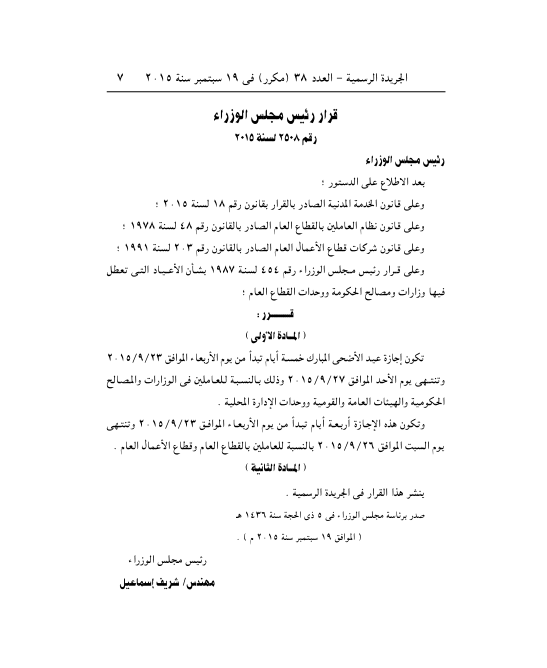 وتكون الإجازة أربعة أيام تبدأ من يوم الأربعاء الموافق 23/9/2015، وتنتهي يوم السبت الموافق 26/9/2015، بالنسبة للعاملين بالقطاع العام وقطاع الأعمال العام.