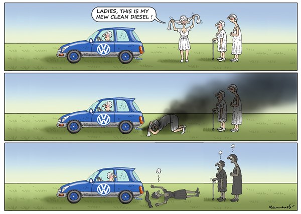 وجه عديد من الصحف العالمية أسهم رساميها نحو الفضيحة التي هزت الشركة العالمية “فولكس فاجن”، بعد أن أقرت بالغش في اختبارات انبعاثات السيارات التي تعمل بالديزل في الولايات المتحدة، حيث قالت كوريا الجنوبية إنها ستجري تحقيقا، في حين دعا وزير فرنسي إلى تحقيق على مستوى الاتحاد الأوروبي، ولعل أشهر الكاريكاتيرات ذلك الذي نشرته صحيفة “واشنطن بوست” للرسام الألماني راينر هاتفيلد: