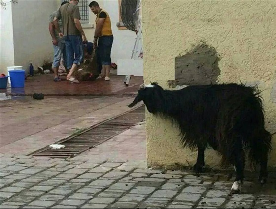 وصورة أخرى لماعز تداولها نشطاء مواقع التواصل الاجتماعي، خلال اختبائها خلف حائط أثناء متابعتها عملية نحر أضحية.