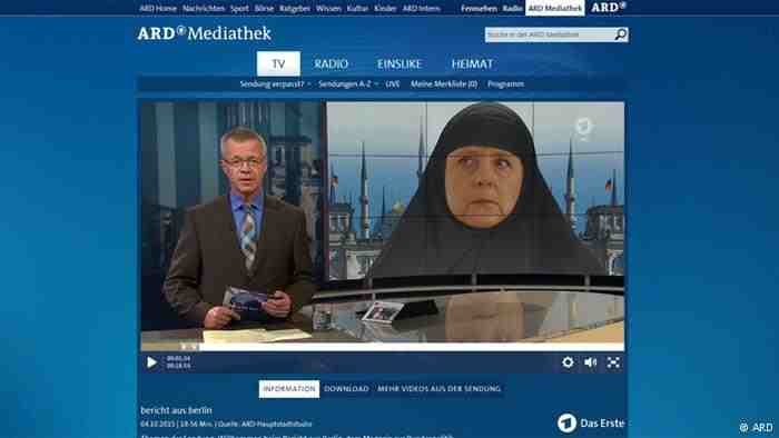 ظهرت المستشارة الألمانية أنجيلا ميركل، وهي ترتدي الحجاب خلال البرنامج الألماني الشهير “مجلة التليفزيون” الذي يبث من برلين، حيث عرضت القناة التليفزيونية الأولى “إيه آر دي” ARD، صورة مركبة لميركل، وهي ترتدي عباءة سوداء اللون، ومن ورائها مبنى الرايخستاج وعليه مآذن ورمز الهلال.