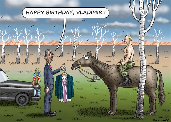 واحتفالاً بعيد ميلاد الرئيس الروسي فلاديمير بوتين، أعادت الرسامة السلوفاكية ماريان كمينيسكي رسم صورة شهيرة لبوتين يمتطي جواد بينما يقابله الرئيس الأميركي أوباما مهنئا بعيد ميلاده.