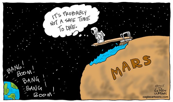 فيما اتجه موقع كاجل نحو اكتشاف المياه على سطح كوكب المريخ، فنشرت كاريكاتير لرائد فضاء يستعد للغطس بينما كوكب الأرض يصدر أصوات الفرقعات الناجمة عن الحروب والصراعات.