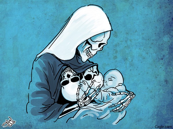 لا تزال الصحف الأميركية مهتمة بالأحداث في سوريا؛ حيث نشرت صحيفة نيويورك تايمز رسمًا يعبر عن حالة البؤس التي وصلت إليها الأمهات السوريات؛ حيث يظهر في الرسم طفل رضيع يتغذى من أم عبارة عن هيكل عظمي.
