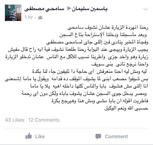 وأضافت “ياسمين” -في منشور لها عبر “فيس بوك”- “اليوم ذهبنا لزيارة سامحي في السجن، وبعدما سجلنا الأسماء، دخلنا استراحة، وفجأة المخبر ينادي “فين اللي جاي لسامحي مصطفى يجيب الزيارة وييجي عند البوابة”.