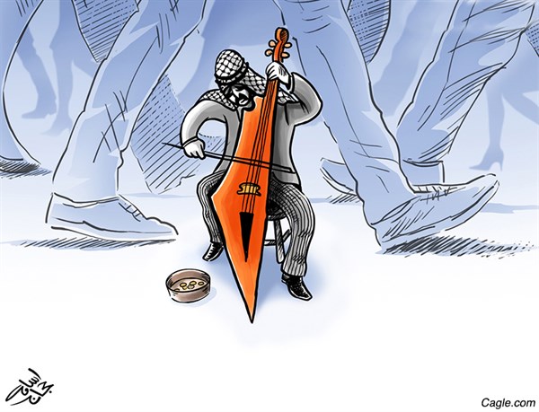 وفي الشأن الفلسطيني نشر “كاجل” رسما يعبر عن أن الشعب الفلسطيني يعزف لحنه الخاص على السكاكين وسط تجاهل العالم.