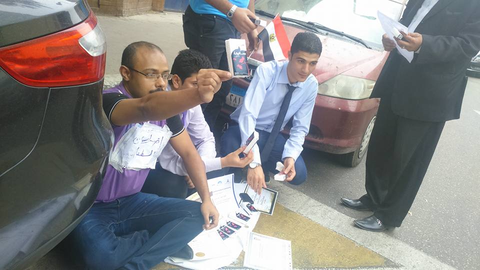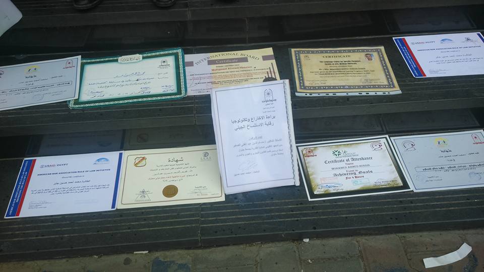 جلس عدد من المحتجين على الرصيف في إشارة المرور وقاموا ببيع المناديل ووضع شهاداتهم على الأرض، في تعبير ساخر عن عدم اهتمام الحكومة بحملة الماجستير والدكتوراه.