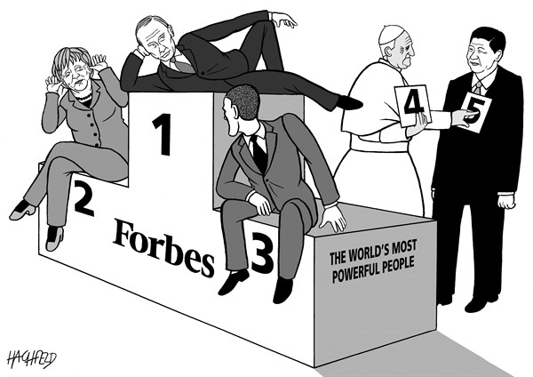 وعن قائمة “فوربس” لأقوى شخصية في العالم هذا العام، نشر “بوليتيكال كارتونز” هذا الرسم: