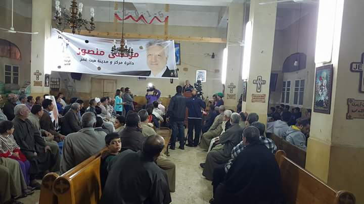 كان المستشار مرتضى منصور، قد عقد أمس السبت مؤتمرا انتخابيا، داخل إحدى الكنائس، أثناء جولته الانتخابية لمنطقة كفور المسيحيين بميت غمر، مستغلا إحدى قاعات المناسبات بالكنيسة في وجود رجال الدين المسيحيين، في تصرف يعد انتهاكا لقانون الانتخابات البرلمانية والذي يمنع استخدام دور العبادة في الدعاية الانتخابية.