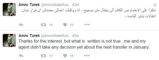 كتب عمرو طارق، على موقع التواصل الاجتماعي “تويتر”: “شكرًا على الاهتمام، بس الكلام اللي بيتقال مش صحيح، أنا ووكيلة أعمالي مخدناش أي قرار بشأن انتقالات يناير القادمة”.