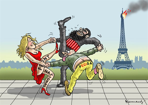 ونشر أيضا “بولتيكال كارتونز” هذا الرسم عن ليلة التفجيرات في فرنسا:
