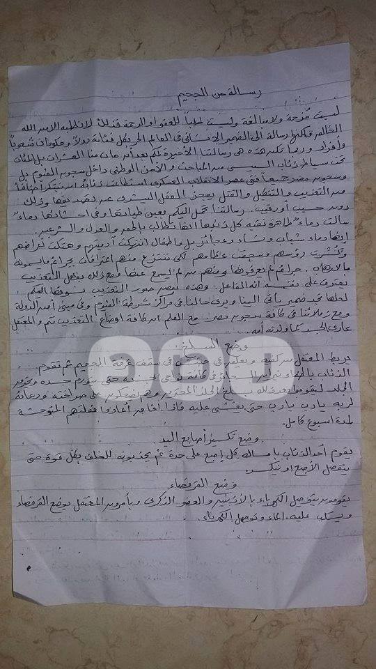كشفت رسالة مسربة من سراديب الأمن الوطني بالفيوم، كتبها أحد المعتقلين بالداخل، وحصلت عليها شبكة “رصد” عن شرح تفصيلي لـ 12 وضعا يعذب بهم المعقلون داخل سجون الأمن الوطني، خاصة في غرفة أطلق عليها غرفة الجحيم لما تشهده من أفظع أنواع التعذيب.