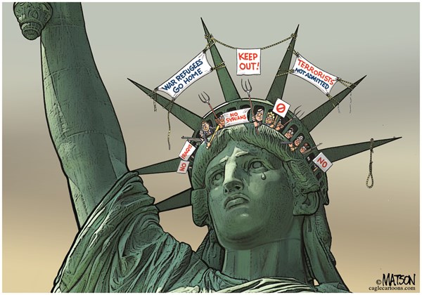 وسخر موقع “بولتيكال كارتونز” من رافضي لجوء العرب لأميركا بهذا الرسم: