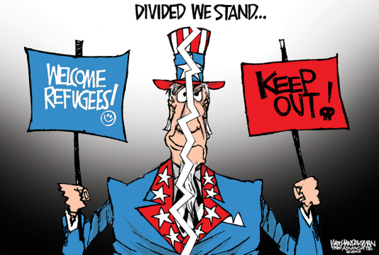 ونشر موقع “يو آي نيوز” الأميركي هذا الرسم معبرا عن حالة الانقسام بشأن استقبال اللاجئين العرب في أميركا:
