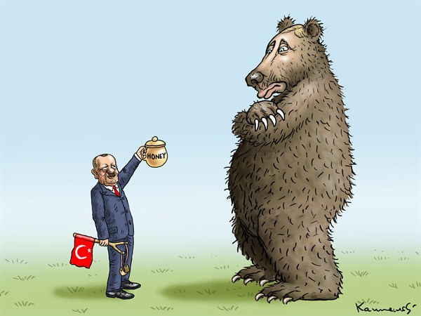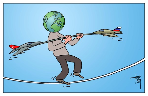 ورأى موقع “بوليتيكال كارتونز” أن الصراع الروسي التركي قد يؤدي إلى اختلال توازن العالم، حيث عبر عن هذه الفكرة من خلال هذا الرسم:
