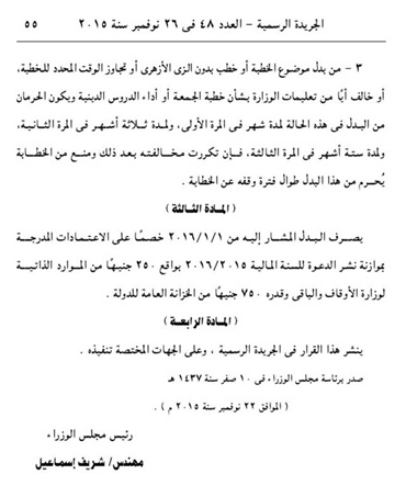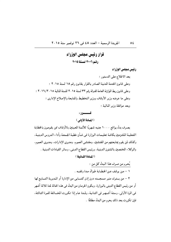 قرر مجلس الوزراء برئاسة المهندس شريف إسماعيل، صرف بدل شهري مقداره ألف جنيه، لأئمة المساجد بوزارة الأوقاف المصرية، وكذلك المفتشين ومفتشي العموم، ومديري الإدارات، ومديري العموم، والوكلاء المختصين بالشؤون الدينية، ورئيس القطاع الديني، وسائر القيادات الدينية.