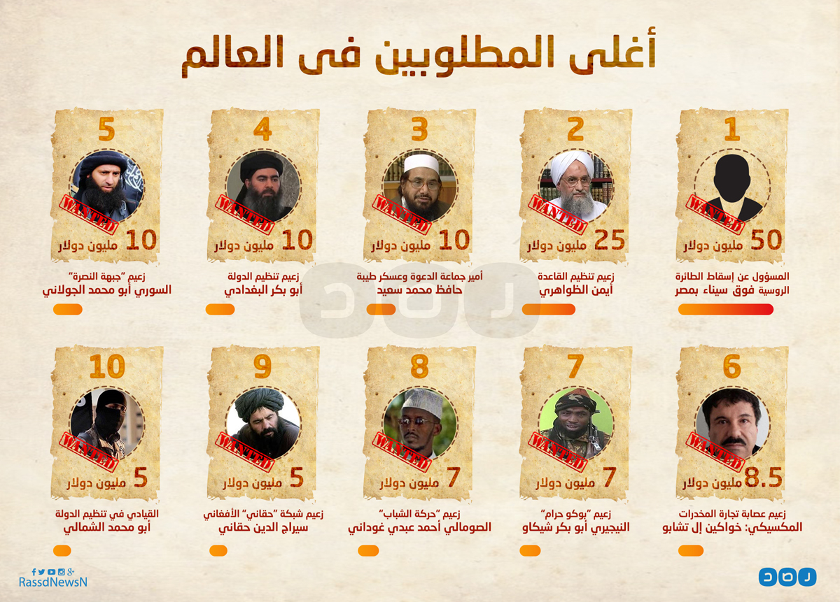 أظهر تقرير قناة روسيا اليوم على موقعها الرسمي على شبكة الأنترنت احتوى صورا لأخطر وأغلى 10 مطلوبين حول العالم، أن زعيم تنظيم “الدولة الإسلامية” أبوبكر البغدادي أرخص من زعيم تنظيم القاعدة أيمن الظواهري، إذ جاء الظواهري في المرتبة الثانية في القائمة ووضعت مكافأة قدرت بـ25 مليون دولار على رأسه، فيما جاء البغدادي في المرتبة الرابعة وبلغت قيمة المكافأة الموضوعة على رأسه 10 مليون دولار.