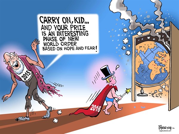 كما نشر موقع “بولتيكال كارتونز” هذا الرسم عن رحيل 2015 وبداية 2016: