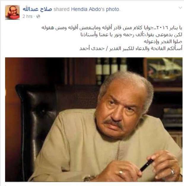 قال الفنان صلاح عبدالله، ناعيا الراحل حمدي أحمد في منشور له على صفحته الرسمي بموقع التواصل الاجتماعي “فيسبوك” :”يا يناير ٢٠١٦.. جوايا كلام مش قادر أقوله وماينفعش أقوله ومش هقولهلكم بدموعي.. ألف رحمه ونور يا عمنا وأستاذنا”.