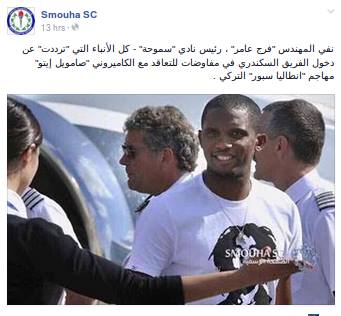 نفى محمد فرج عامر، رئيس نادي سموحة، ما تردد في بعض وسائل الإعلام خلال الساعات القليلة الماضية، عن نيته في التعاقد مع صامويل إيتو، لاعب فريق إنطاليا سبور التركي.