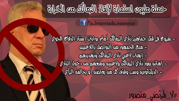 دشن عدد من جمهور نادي الزمالك، حملة عبر موقع التواصل الاجتماعي “فيس بوك”، لإقالة رئيس النادي مرتضى منصور، تحت عنوان “حملة مليون استمارة لإنقاذ الزمالك من الخرارة”.