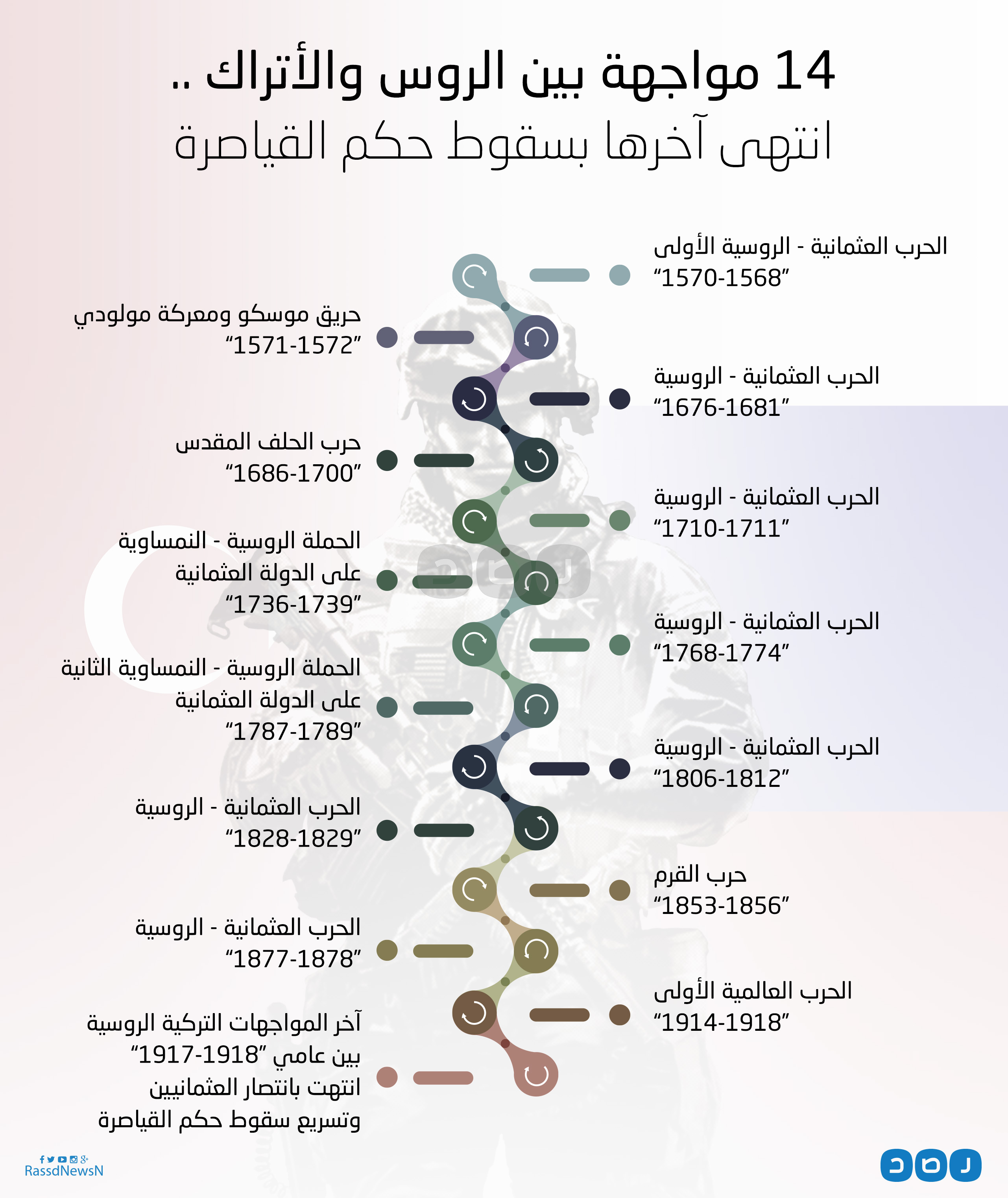 جرت 14 مواجهة حربية بين الروس والأتراك، منذ الحرب العثمانية في القرن السادس عشر الميلادي، وحتى الحرب العالمية الأولى في القرن العشرين.