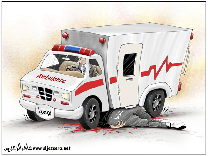 وقدم موقع “الجزيرة دوت نت” كاريكاتيرًا عن ادعاءات روسيا إنقاذها الشعب السوري: