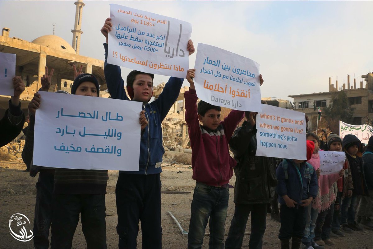 تداول العديد من رواد مواقع التواصل الاجتماعي، صورا لعشرات من النساء والأطفال الذين خرجوا في اعتصام للمطالبة بفك الحصار عن مدينتهم، ووقف القصف اليومي الذي يهدد حياتهم، ونشر الحساب الرسمي للمدينة على موقع التواصل الاجتماعي “تويتر”، العديد من صور الاعتصام.