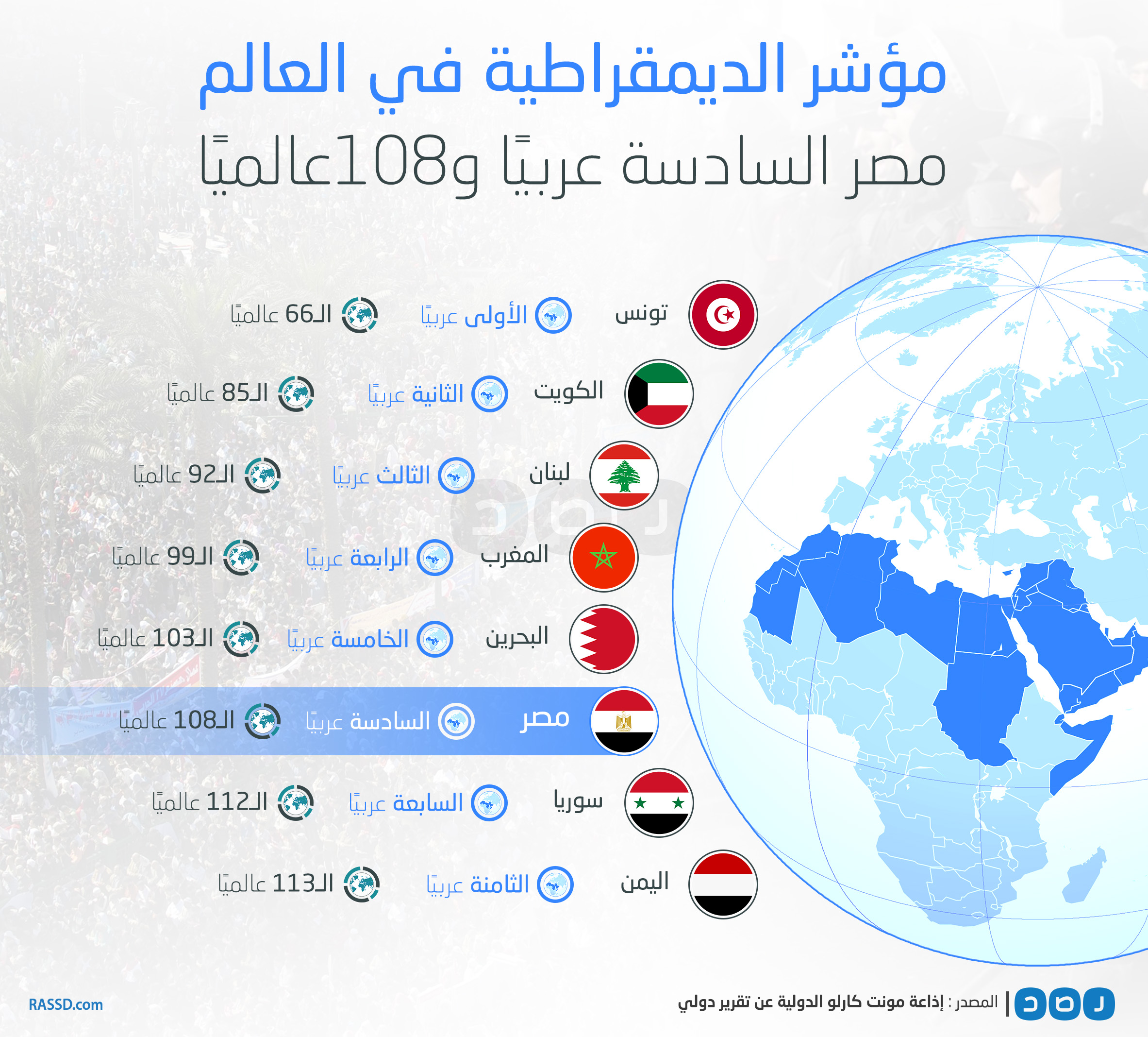 احتلت ثماني دول عربية، مراكز مختلفة في أحدث تصنيف لمؤشر الديمقراطية في العالم؛ حيث تصدرت تونس القائمة عربيًا، بينما تذيلت اليمن القائمة عربيًا وعالميًا، في حين احتلت مصر المرتبة السادسة عربيًا و108عالميًا.